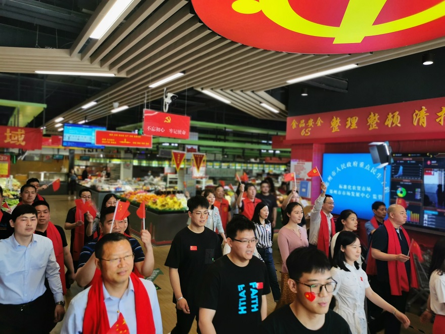 ? ? ? 上午9時(shí),伴隨著悠揚(yáng)的音樂聲,公司員工一邊揮舞著手中的黨旗,一邊放聲歌唱,緩緩從喧鬧的市場中走出,一場持續(xù)約6分鐘的紅歌“快閃”活動(dòng)讓濃濃的愛黨愛國情愫涌動(dòng)在每個(gè)人的心里?;顒?dòng)現(xiàn)場,在音樂旋律的感染下,前來購物的市民以及市場商戶也從四面八方匯聚而來,有的掏出手機(jī)拍照,有的一起參與,深情的歌聲漸漸演變成大合唱,所有人用慷慨激昂、精神飽滿的歌聲表達(dá)出對偉大中國共產(chǎn)黨的真誠歌頌。大家用紅色的海洋、激昂的情感、高亢的歌聲,展現(xiàn)著新時(shí)代共產(chǎn)黨員的風(fēng)采。